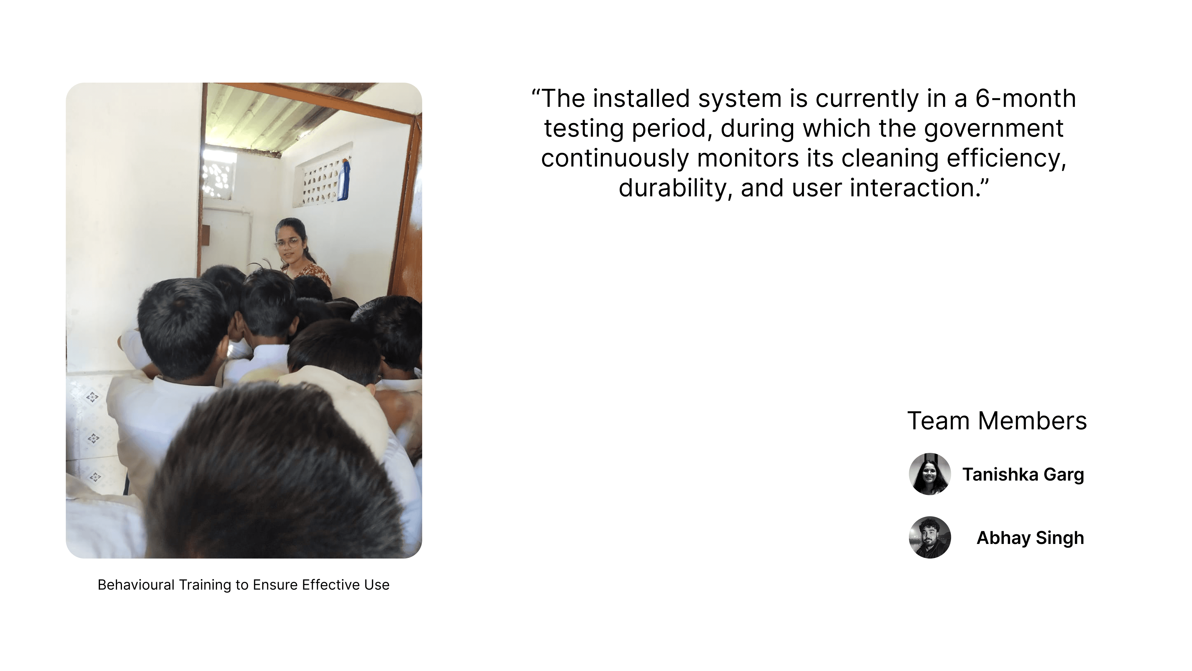 We propose a sustainable, non-electric self-cleaning toilet system that maintains hygiene using simple water-flow mechanisms. It is low-cost, eco-friendly, and scalable for government schools across Assam.